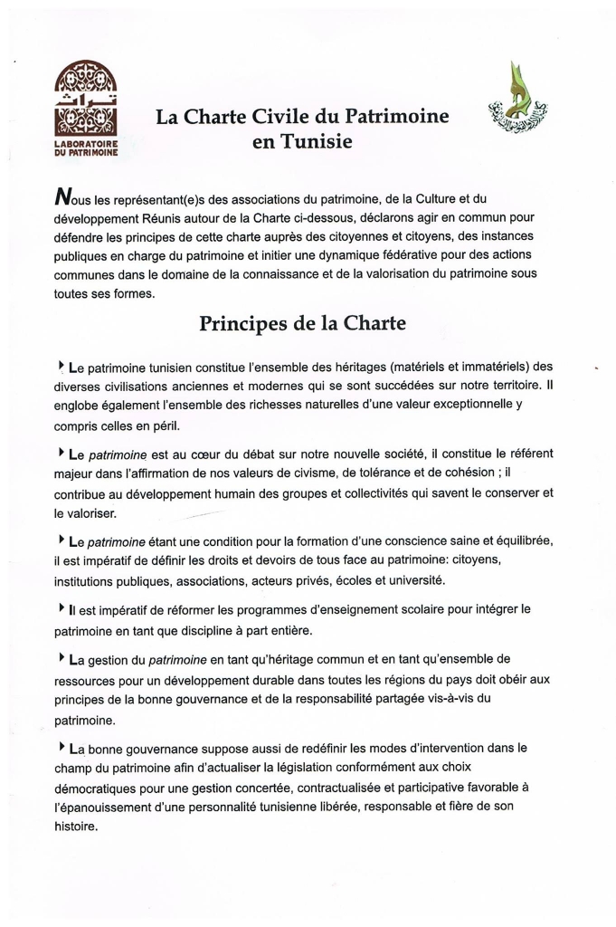 Les représentants des associations du patrimoine, de la culture et du développement, se sont réunis autour de la « Charte Civile du Patrimoine en Tunisie ». Signée le 16 mai 2015, elle vise à instaurer la mise en commun de l’action de sensibilisation auprès des citoyens et des instances publiques en charge du patrimoine. Son objectif est également d’initier une dynamique fédérative pour ses actions communes dans le domaine de la connaissance et de la valorisation du patrimoine sous toutes ses formes.
