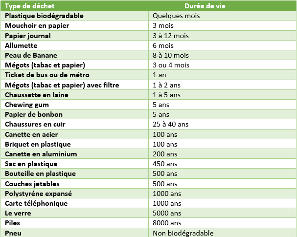 D’abord, tous les déchets ne nécessitent pas la même durée de temps pour se dégrader dans la nature :
