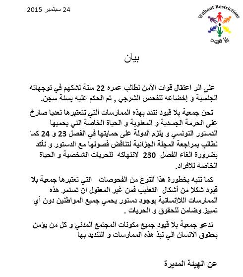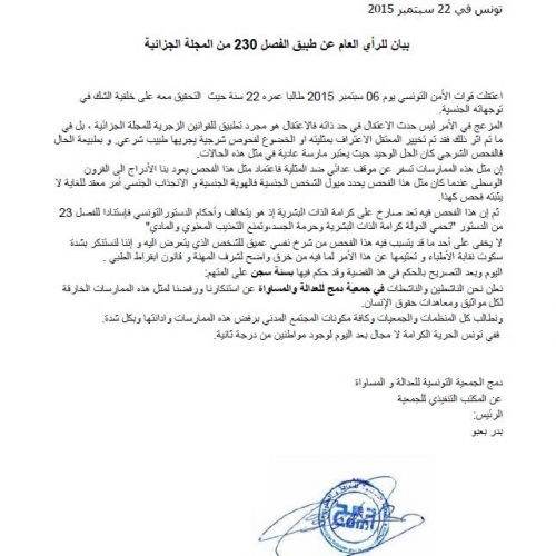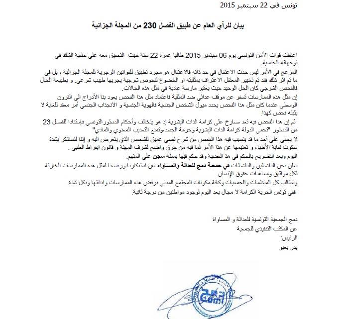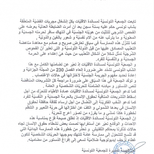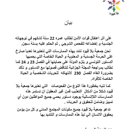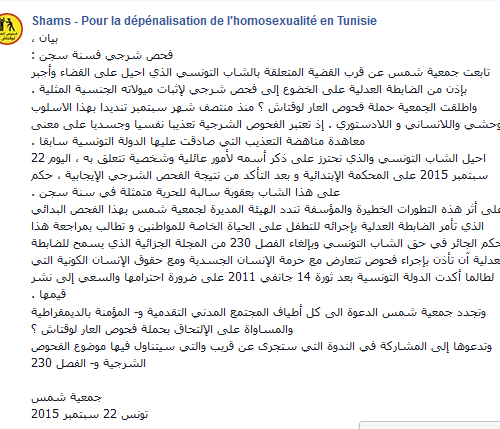 Il est à connaitre qu’en Tunisie l’article 230 du code pénale criminalise l’homosexualité (relation entre deux individus du même sexe).