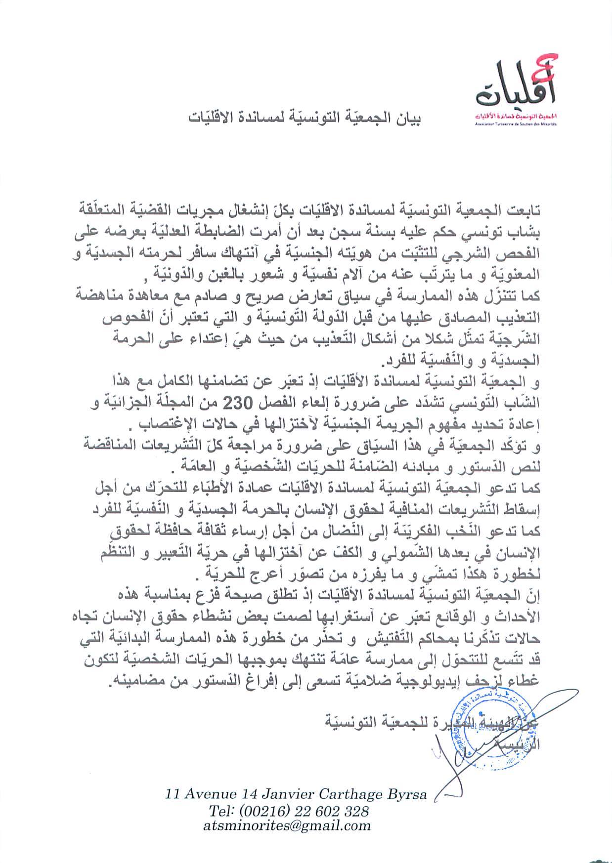 L’association de soutien des minorités a clairement déclaré qu’une telle pratique outre son atteinte aux droits humains représente une effraction de la convention internationale contre la torture qui est ratifiée par l’Etat tunisien.