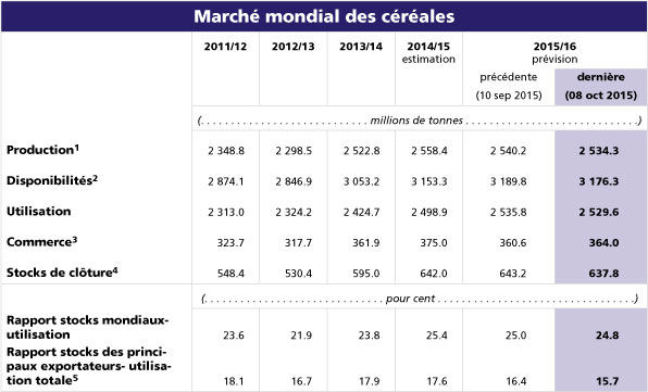 Concernant l’offre mondiale des produits agricoles une forte croissance a été enregistrée pour la plupart des produits. Le blé a notamment connu une récolte record en 2015 avec prés de 728 millions de tonnes. Ces bonnes performances ne sont pas propres qu’au blé et concernent l’ensemble des céréales. Ainsi la FAO estime les stocks mondiaux de céréales à 643 millions de tonnes.