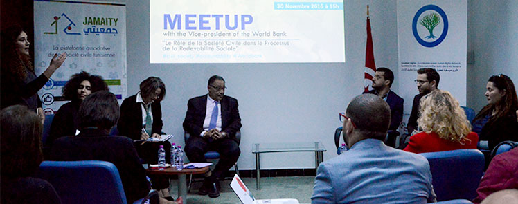 Le mercredi 30 novembre, a été organisé un Meetup de la société civile avec le vice-président de la Banque Mondiale par l’association Jamaity et en partenariat avec l’Euromed Droits, ayant eu pour thématique «Rôle des associations de Jeunesse dans la redevabilité sociale».
