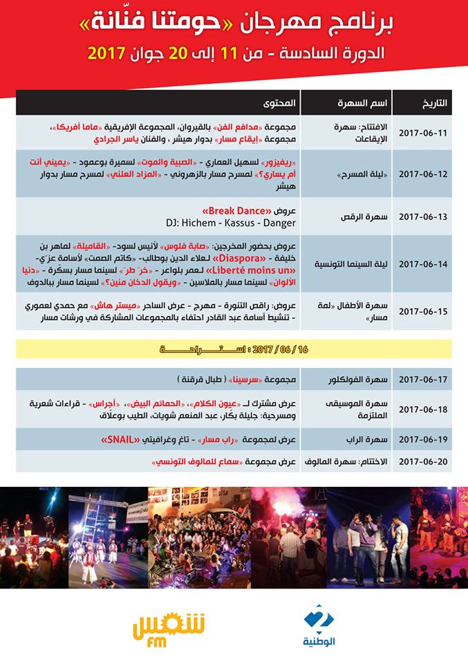 ينطلق المهرجان هذه الليلة » 11 جوان » في دورته السادسة بسهرة الايقاعات ولقاء مع مجموعة مدافع الفن بالقيروان ، المجموعة الإفريقية ماما أفريكا ‘ مجموعة إيقاع مسار بدوار هيشر والفنان ياسر الجرادي.وتخصص سهرة 12 جوان للمسرح ويلتقي الجمهور مع مسرحيات:ريفيزور لسهيل العماري والصبية والموت لسميرة بوعمود ويميني أنت أم يساري؟ لمسرح مسار بالزهروني و المزاد العلني لمسرح مسار بدوار هيشر. أما سهرة 13جوان فستكون مخصصة للرقص العصري المسمى بريكدانس