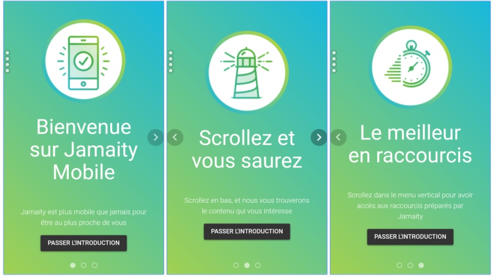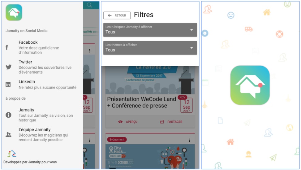 Les utilisateurs peuvent également gérer leur navigation dans le menu de l’application Jamaity Mobile et sélectionner le contenu à consulter par type ou par domaine. Des raccourcis et des fonctionnalités viennent faciliter l’expérience digital qu’offre l’application à son visiteur, l’invitent à réagir au contenu, et interagir avec l’équipe de Jamaity.