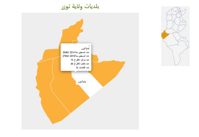 وتتضمّن الخارطة الانتخابية لدائرة توزر كل المعطيات المتعلقة بعدد المسجلين وعدد القائمات وعدد المقاعد بكل بلدية. وسيتمّ التنسيق في الفترة القادمة مع إطارات الهيئة الفرعية بتوزر لمزيد تطوير وحسن إستعمال والتصرّف في بيانات المنصّة الإلكترونية.