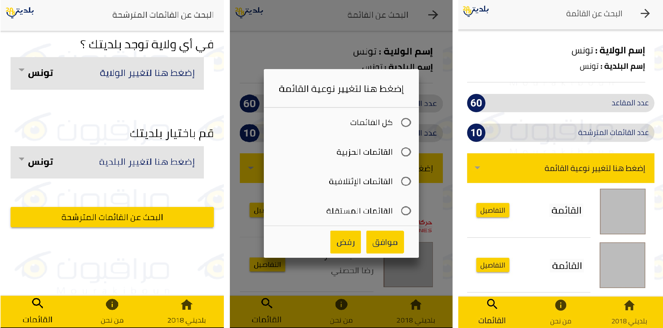 Pour faciliter l’accès à l’information, l’application permet de sélectionner la liste recherchée selon l’emplacement (gouvernorat, communauté), et selon le type de liste (liste partisane, liste de coalition ou liste indépendante). Baladiyati 2018 affiche des informations complètes et vérifiées: nom de la liste, type de la liste, président de la liste, les candidats, le programme électoral..