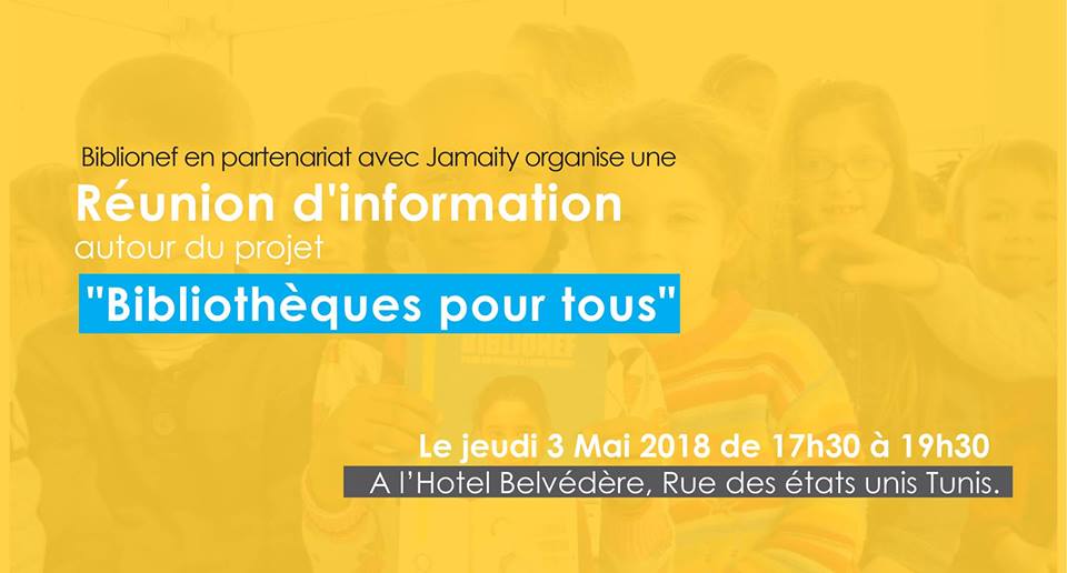 نظمت جمعيّة » بيبليوناف – biblionef » يوم الخميس 03 ماي 2018 بالتعاون مع » جمعيتي » بتونس العاصمة اجتماعا إعلاميا لتقديم مشروعها المتمثّل في خلق مكتبات للجميع.