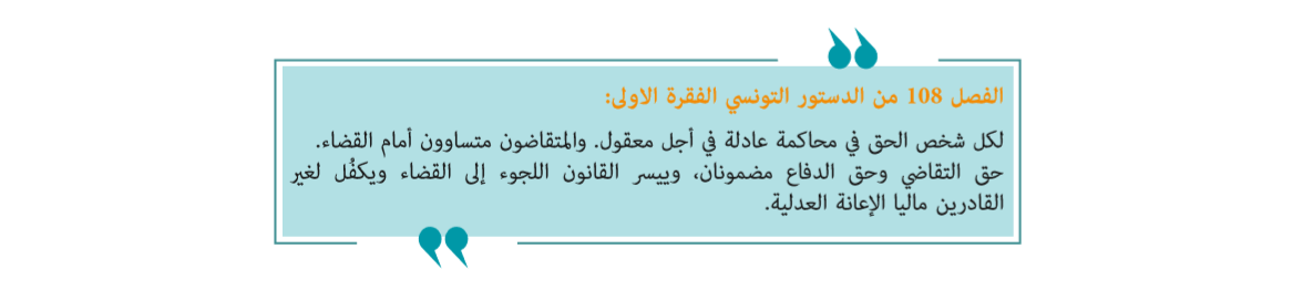 ينصّ الدستور التونسي الجديد لسنة 2014 على أن  » القانون ييسر اللجوء إلى القضاء ويكفل للغير القادرين ماليا الإعانة العدلية. فمن منطلق أنّ النفاذ إلى العدالة يعتبر أحد أهم مبادئ سيادة القانون و حـقا أساسـيا و شرطا ضــروريا لحمايــة وتعزيــز ســائر الحقــوق المدنيــة والثقافيــة والاقتــصادية والــسياسية و الاجتماعيّة ، يتوجب على الدول أن تعمل على إزالة كل العقبات التي تحول دون النفاذ إلى العدالة و وضع إطار قانوني ومؤسساتي يسهل النفاذ إلى القانون و الإعانة القضائية. في تونس ، رغم بعض الانجازات التشريعية التي تهدف إلى تعزيز خدمات الإعانة القضائية وحضور المحامي يبدو أن المنظومة بأكملها لا تلبي احتياجات المتقاضي  المعرض للانتهاكات خلال فترة الاحتفاظ.
