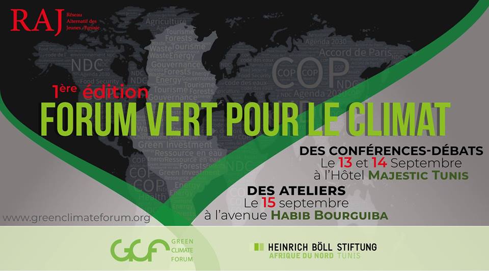 تم إطلاق النسخة الأولى من « منتدى المناخ الأخضر »، يوم الخميس 13 سبتمبر وذلك لتوعية المواطنين والسياسيين عن أهمية تغيير السياسة البيئية الوطنية في مواجهة تغير المناخ الجديد ، مع إشراك جميع أصحاب المصلحة. عقدت المنظمة هذا المنتدى على امتداد 3 أيام و استمرّ من 13 إلى 15 سبتمبر ،و مثّل فرصة لعرض المبادرات المختلفة في مجال البيئة والمناخ في تونس.المنتدى كان أيضا بمثابة مساحة لتحفيز النقاش حول البيئة بين مختلف المناطق وتقديم وجهات نظر مختلف الأطراف المعنية بشأن الوضع البيئي في البلاد.