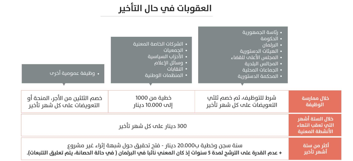 إذا تجاوز المعنيون بالتصريح هذه الآجال و لم يدلوا بمكاسبهم و مصالحهم يتلقّون العقوبات التالية :