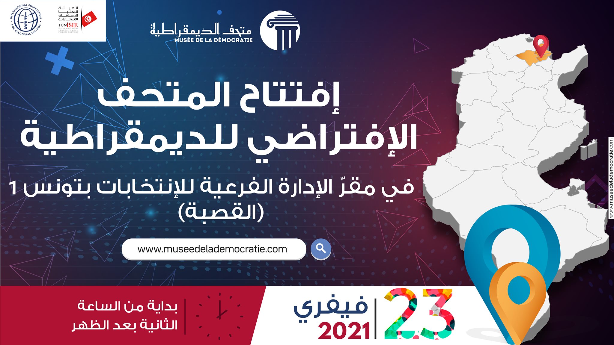 تفتتح الهيئة العليا المستقلة للانتخابات بالشراكة مع المؤسسة الدولية للنظم الانتخابية يوم الثلاثاء 23 فيفري 2021 المتحف الإفتراضي للديمقراطية على الساعة الثانية ظهرا بمقرّ الادارة الفرعية للانتخابات تونس 1 (القصبة) مع العلم أن المتحف سيكون مفتوح للعموم في نفس المقرّ من يوم الاثنين إلى يوم الجمعة من الساعة العاشرة صباحا إلى الساعة الرابعة مساء.