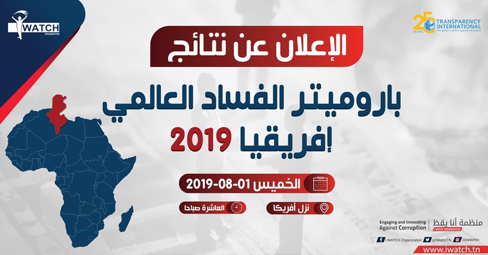 تتشرف منظمة أنا يقظ بدعوتكم الى حضور ندوة صحفية للإعلان عن نتائج باروميتر الفساد العالمي –إفريقيا 2019، وذلك يوم الخميس 01 أوت بداية من الساعة العاشرة صباحا بنزل الأفريكا
