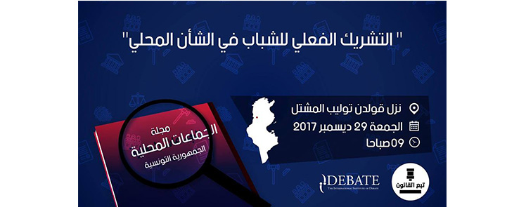 « اختتاما لبرنامج « تبع القانون » للمعهد الدولي للمناظرات، نتشرف بدعوتكم لحضور تظاهرة تحت عنوان: « التشريك الفعلي للشباب في الشأن المحلي