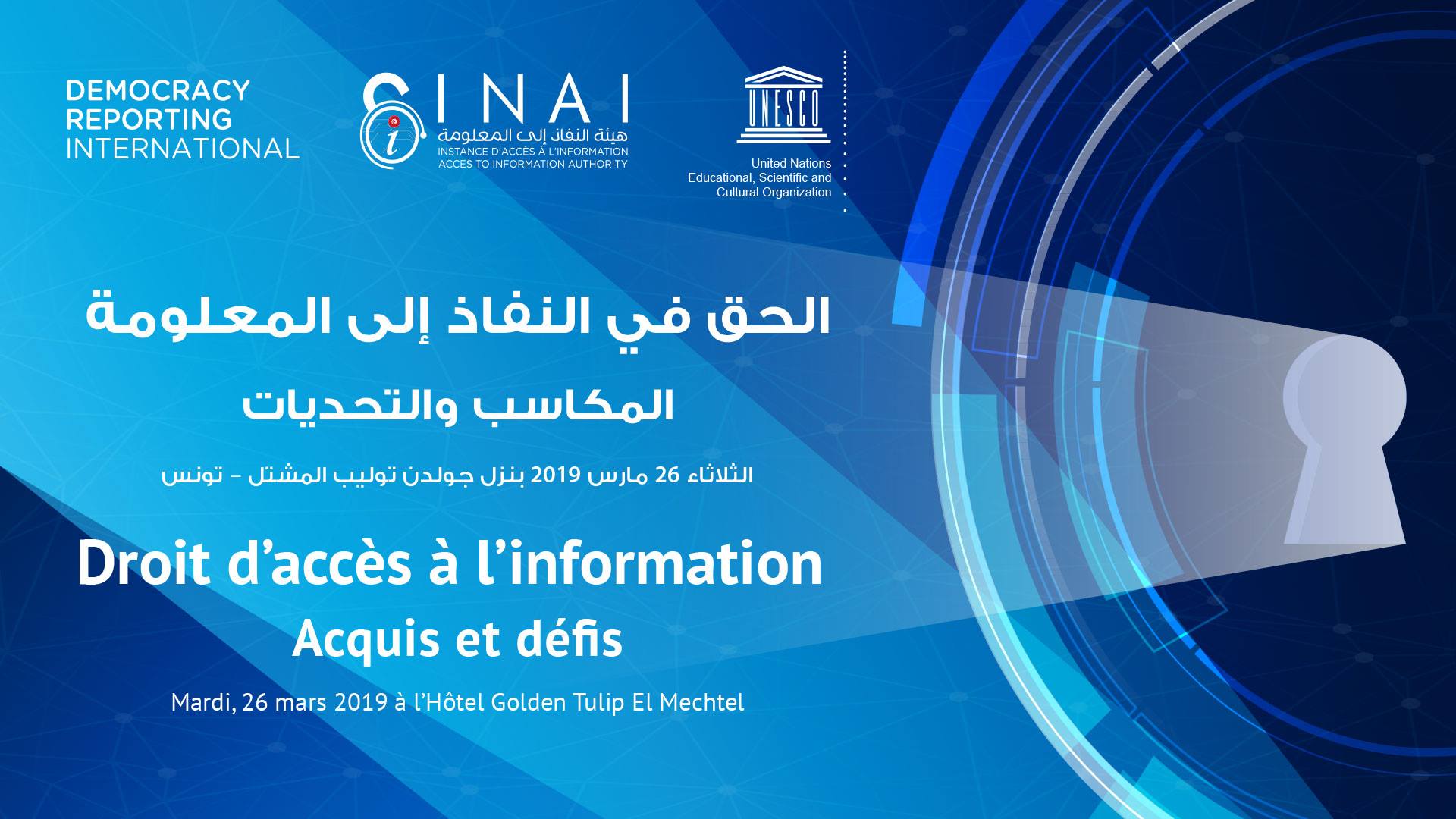 A l’occasion du deuxième anniversaire de la loi organique n°22-2016 du 24 mars 2016 relative au droit d’accès à l’information, l’Instance d’Accès à l’Information (INAI) en partenariat avec Democracy Reporting International (DRI) et l’Organisation des Nations Unies pour l’Education, la Science et la Culture (UNESCO) organise une rencontre Mardi 26 mars 2016 à l’Hôtel Golden Tulip, El Mechtel Tunis à partir de 8h30 jusqu’à 16h30 intitulée :