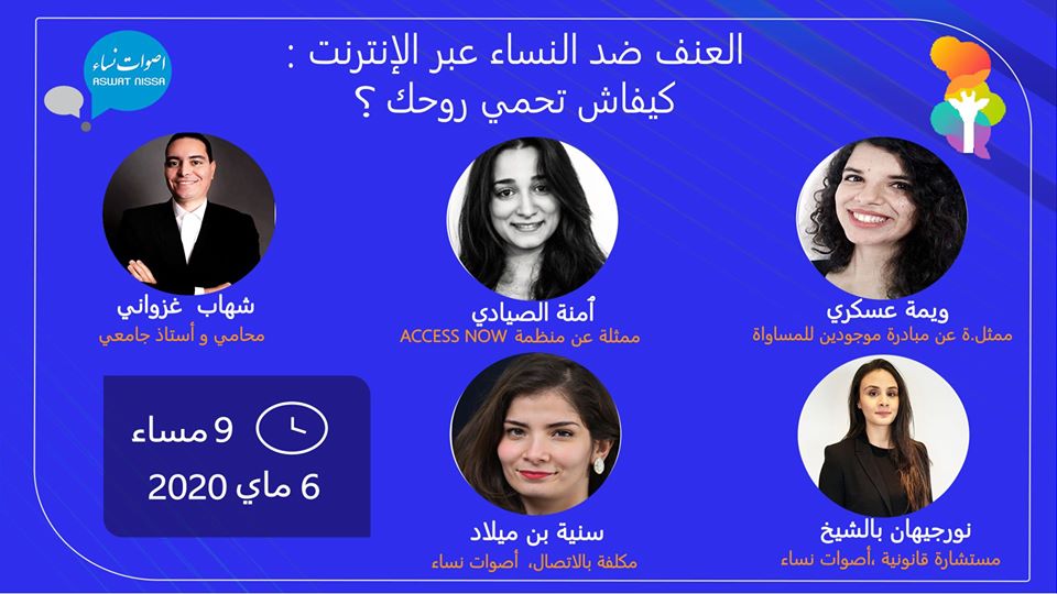 ملي بدا الحجر الصحي و أحنا نشوفوا في العنف المسلط على النساء قاعد يزيد و من أكثر أنواع العنف المنتشر في الفترة هذي هو العنف المسلط عبر الأنترنت. هذاك علاش بش نعملو ندوة إفتراضية بش نحكيو على الموضوع و نفهمو كفاه نجمو نحميو رواحنا إلكترونيا و قانونيا. سوف يتم بث هذه الندوة على الصفحات الرسمية لأصوات نساء و موجودين وعلى مجموعة أنا زادة ;و ذلك يوم الأربعاء 6 ماي 2020 على الساعة التاسعة مساءا