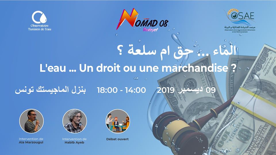 Suite à la publication de la charte de la Tunisie pour le Droit à l’#eau (https://www.watchwater.tn/fr/blog/2019/11/7/35-droit_eau_tunisie/), l’association Nomad08 dans le cadre de son projet l’Observatoire Tunisien de l’Eau, organise un cycle de débats autour des principaux fondements du code citoyen des eaux.