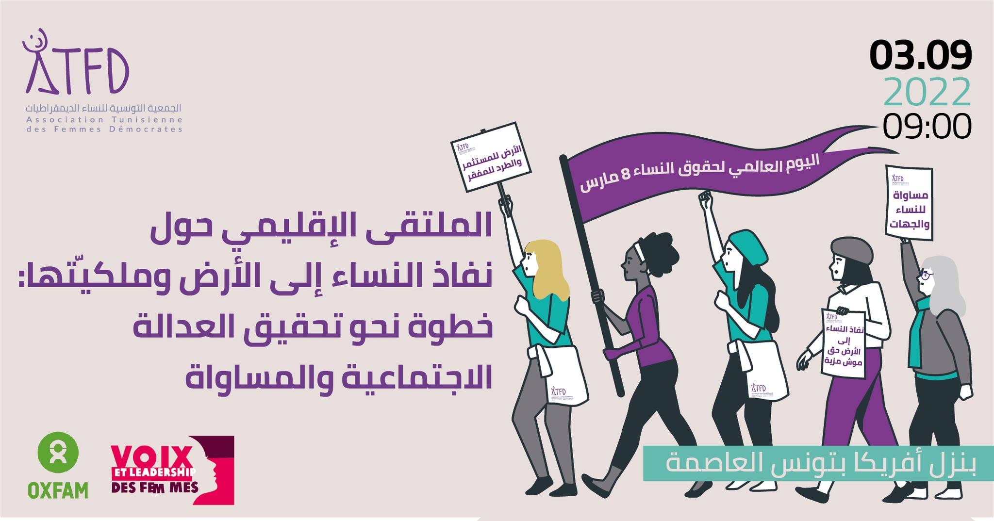 بمناسبة احياء اليوم العالمي لحقوق النساء 8 مارس ، تنظم الجمعية التونسية للنساء الديمقراطيات ملتقى اقليميا تحت شعار « نفاذ النساء إلى الأرض وملكيتها: خطوة نحو تحقيق العدالة الاجتماعية والمساواة ».