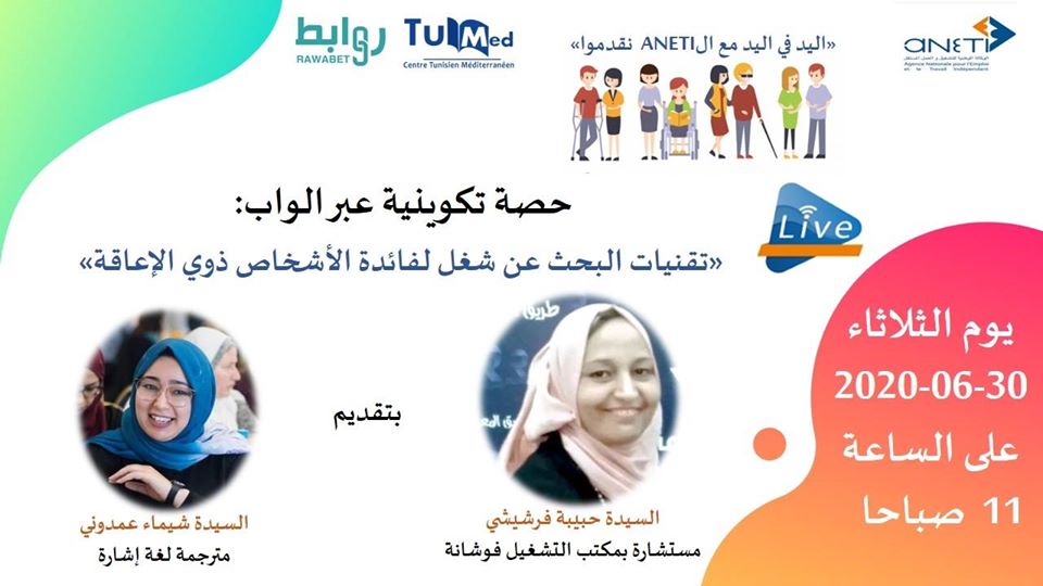 في اطار الشراكة بين الوكالة ANETI والمركز التونسي المتوسطي TUMED (مبادرة روابط) تعتزم الوكالة تقديم حصة تكوينية عبر الواب لفائدة الاشخاص ذوي الاعاقة خاصة بتقنيات البحث عن شغل بتقديم السيدة حبيبة الفرشيشي مستشارة للتشغيل ومكلفة بالاشخاص ذوي الاعاقة بمكتب تشغيل فوشانة والسيدة شيمة عمدوني مترجمة لغة اشاراة وذلك يوم الثلاثاء 30 جوان 2020 على الساعة 11 صباحا على صفحة الفايسبوك FB الخاصة بالوكالة وصفحة روابط ، وعلى الراغبين في المشاركة يمكنهم الدخول على الرابط :
