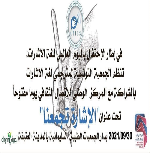 في إطار الإحتفال باليوم العالمي للغة الاشارات،تنظم الجمعية التونسية لمترجمي لغة الاشارات ATILS بالشراكة مع المركز الوطني للاتصال الثقافي يوما مفتوحاً تحت عنوان »الإشارة تجمعنا » وذلك بتاريخ 30/09/2021 بدار الجمعيات الطبية السليمانية بالمدينة العتيقة