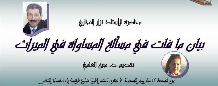 في إطار تظاهرة #قناديل_تونس_الفتاة، تنظّم جمعية تونس الفتاة محاضرة يلقيها القاضي والباحث نزار الفجّاري بعنوان « بيان مافات في مسألة المساواة في الميراث » وذلك يوم الجمعة 17 ماي 2019 بداية من الساعة التاسعة والنصف ليلا بمقر الجمعية: 9 نهج النصر (قرب شارع قرطاج)، تونس العاصمة.