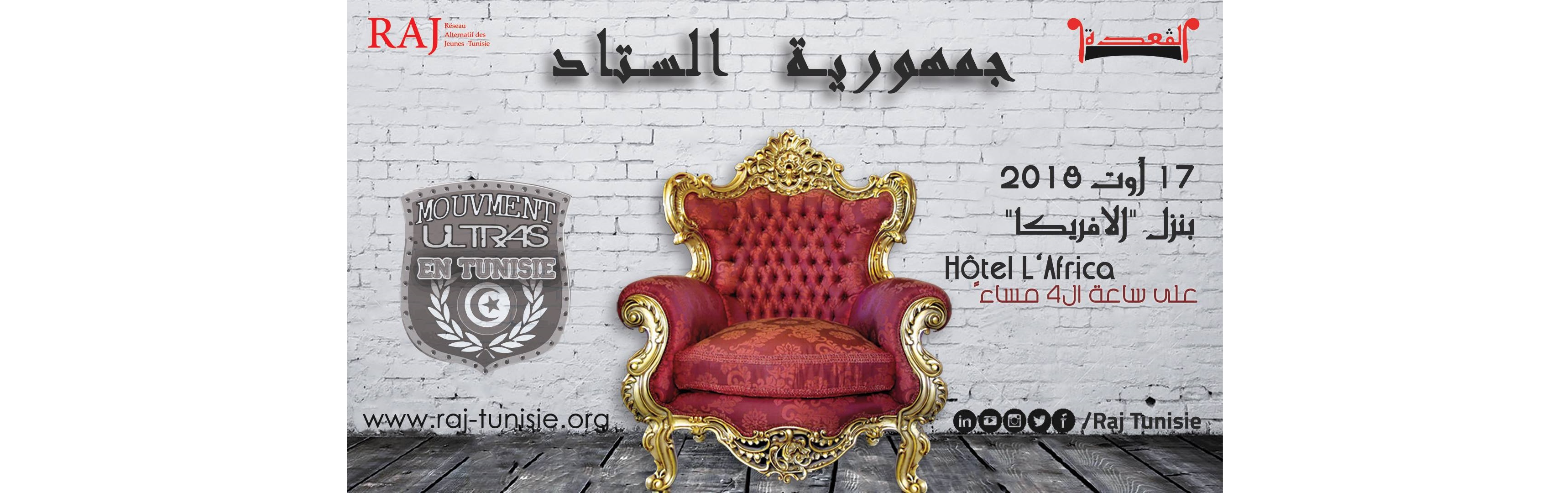 استكمالاً لسلسلة اللقاءات التي تنظّمها حول الحركات الشبابية، تدعوكم منظمة راج تونس لحضور « الڤعدة » يوم الجمعة 17 أوت على الساعة الرابعة مساءًا بنزل الأفريكا تحت عنوان « جمهورية الستاد »، و ذلك بحضور ضيوف من تجارب مختلفة للحديث عن الالترس و مجموعات التشجيع من مقارباتٍ مختلفة