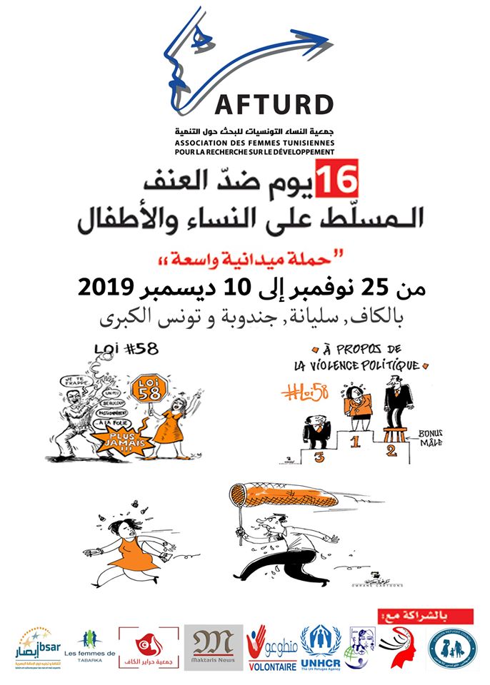 تطلق جمعيّة النساء التونسيات للبحث حول التنمية حملة 16 يوم ضدّ العنف المسلّط على النّساء، من 25 نوفمبر إلى 10 ديسمبر 2019.