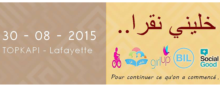 Fondation du programme des Nations Unies, organisent une action de collecte des cartables et de tabliers et d’achat de fournitures scolaires au profit des enfants défavorisés et nécessiteux sous le thème “خليني نقرا Édition spéciale” Lundi 30 Août 2015 à Topkapi en partenariat avec les étudiants ayant le projet “خليني نقرا”