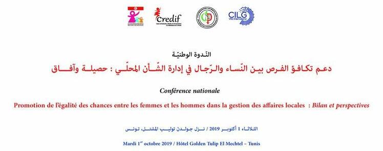 Dans le cadre des activités du Comité National pour la Promotion de l’Egalité entre les femmes et les hommes dans la Gestion des Affaires Locales (CNP-EGAL), le Centre de Recherches d’Etudes, de Documentation et d’Information sur la Femme (CREDIF) et le Centre International de Développement pour la Gouvernance Locale (CILG VNG International) organisent conjointement une conférence nationale sous le thème : »Promotion de l’égalité des chances entre les femmes et les hommes dans la gestion des affaires locales : bilan et perspectives », et ce le mardi 1er octobre 2019 à l’hôtel Golden Tulip El Mechtel à partir de 8h30 du matin.