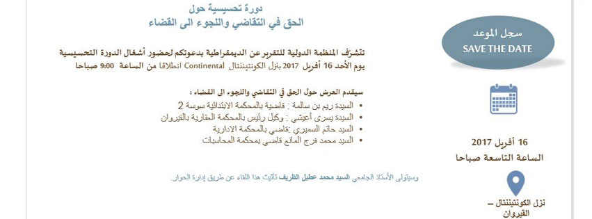 تنظم المنظمة الدولية للتقرير عن الديمقراطية دورة تحسيسية بالقيروان يوم الاحد 16 أفريل 2017 حول الحق في التقاضي واللجوء الى القضاء وذلك بالشراكة مع: