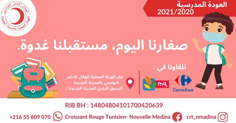 تلقاونا كل يوم قدام المغازة العامة بالياسمينات وكارفور المدينة الجديدة ابتداءا من الساعة 6 فالعشية علما و أن التبرعات لا تقتصر على الأدوات و الكتب الجديدة و إنما تشمل الكتب و الأدوات الصالحة للإستعمال والفلوس زادة الي نجموا نشريو بيها والا نوفروا بيها وصولات شراء للعائلات باش تشري بيها اللوازم الدّراسية.