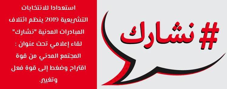 استعدادا للانتخابات التشريعية 2019 ينظم ائتلاف المبادرات المدنية « نشارك » لقاء إعلامي تحت عنوان : المجتمع المدني من قوة اقتراح و ضغط إلى قوة فعل وتغيير. يوم الثلاثاء 05 مارس 2019 على الساعة التاسعة صباحا بنزل الجلدن توليب المشتل بتونس.