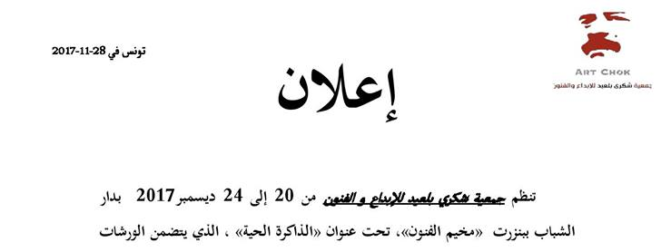 تنظم جمعية شكري بلعيد للإبداع و الفنون من 20 إلى 24 ديسمبر 2017 بدار الشباب ببنزرت «مخيم الفنون»، تحت عنوان «الذاكرة الحية» ، الذي يتضمن الورشات التالية: