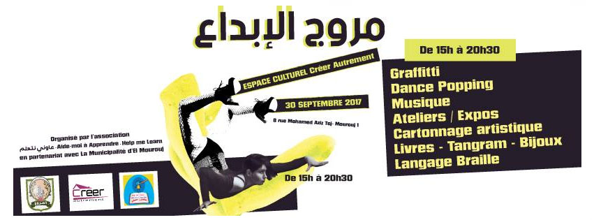 تظاهرة « مروج الإبداع » هي امسية ثقافية متميزة في الفضاء الخارجي المحيط بمقر الجمعية في نهج ابن منظور و نهج محمد عزيز تاج- المروج 1 للتعريف بالنوادي الثقافية التي سنؤمنها بداية من شهر أكتوبر2017 للجمعية وخلق حركية احتفالية تؤثثها مجموعة من الشباب من المروج و غيرها. كونوا في الموعد