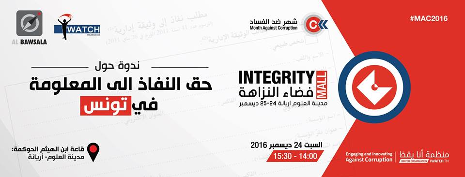 تدعو منظمتا « انا يقظ » و »البوصلة » لحضور ندوة حول حق النفاذ الى المعلومة في تونس وذلك بقاعة ابن الهيثم بمدينة العلوم يوم االسبت 24 ديسمبر 2016 من الساعة 14:00 الى الساعة 15:30.