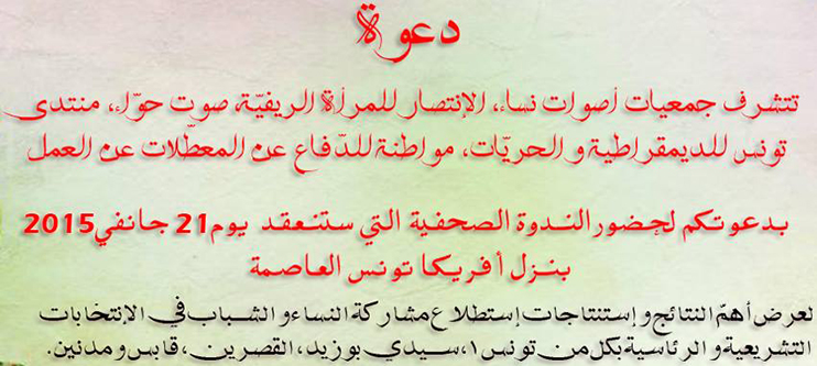 ندوة صحفية لجمعيات أصوات نساء، الإنتصار للمرأة الريفية، صوت حواء، منتدى تونس للديمقراطية و الحريات و جمعية مواطنة للدفاع عن المعطلات عن العمل عودة إلى الأجندة