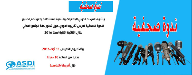 يتشرف المرصد الدولي للجمعيات والتنمية المستدامة بدعوتكم لحضور الندوة الصحفية لعرض تقريره الدوري حول تطور حالة الجتمع المدني خلال الثلاثية الثانية لسنة 2016 وذلك يوم الخميس 11 أوت 2016 بداية من الساعة 10 صباحا بنزل أفريكا بالعاصمة وسيقد المرصد خلال الندوة احصائيات و مخطاطات بيانية و توصيات تقم لأول مرة