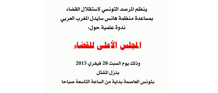 ينظم المرصد التونسي لاستقلال القضاء بمساعدة منظمة هانس سايدل المغرب العربي ندوة علمية حول « المجلس الاعلى للقضاء »