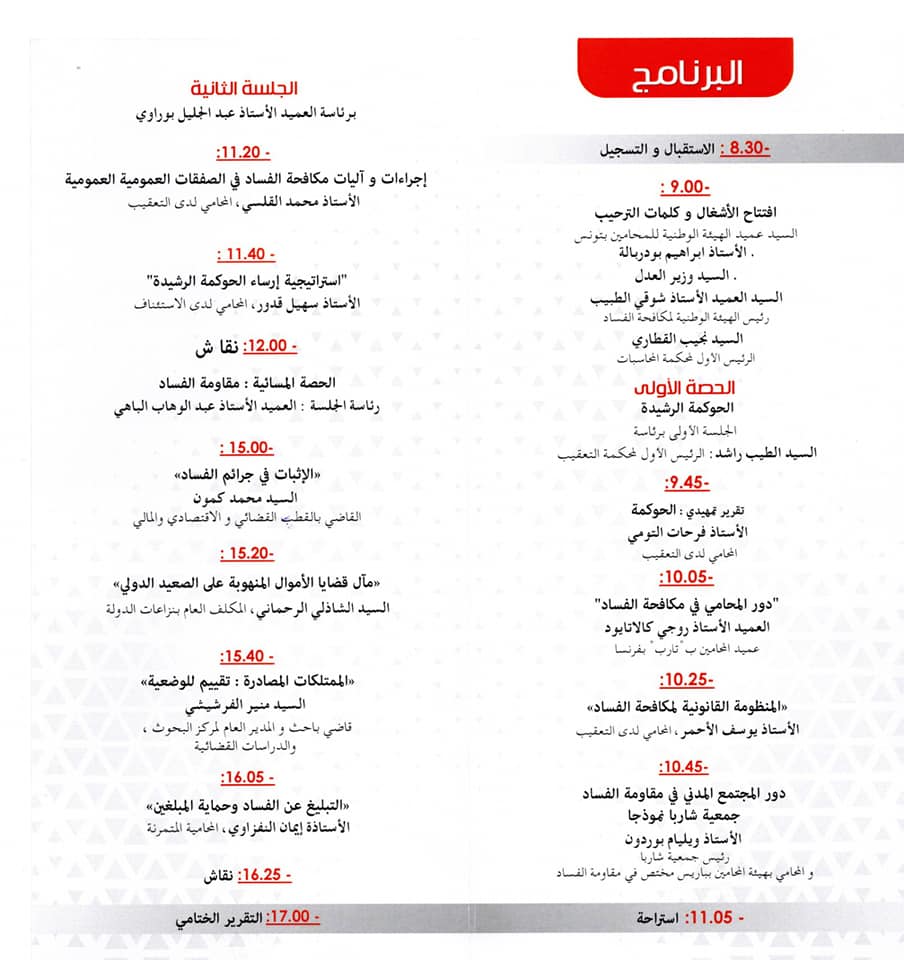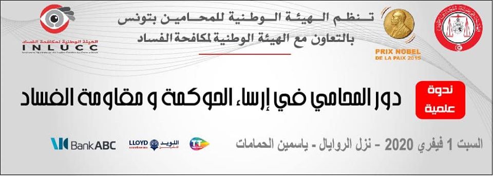 تنظم الهيئة الوطنية لمكافحة الفساد بالشراكة مع الهيئة الوطنية للمحامين بتونس، يوم السبت 01 فيفري 2020، ندوة علميّة تحت شعار « دور المحامي في إرساء الحوكمة ومقاومة الفساد ».