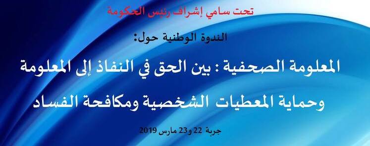 تحت سامي إشراف رئيس الحكومة يوسف الشاهد تنظم مصالح العلاقة مع الهيئات الدستورية والمجتمع المدني وحقوق الإنسان بالتعاون مع جمعية التثقيف الإعلامي بمدنين وفي إطار برامج الشراكة مع الوكالة الفرنسية للتنمية ومركز فرنسا الدولي للإعلام ومركز « إفادة للجمعيات، ندوة وطنية حول « المعلومة الصحفية: بين الحق في النفاذ إلى المعلومة وحماية المعطيات الشخصية ومكافحة الفساد » وذلك يومي 22 و23 مارس 2019 بمدينة جربة.