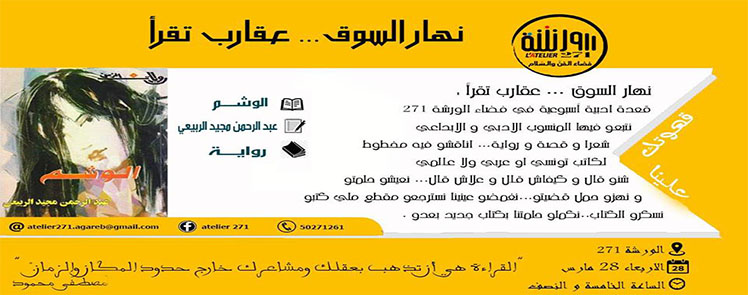 موعدنا الأول من اللقاء الادبي الأسبوعي « نهار السوق … عقارب تقرأ » سيكون يوم الأربعاء القادم 28 مارس 2018 بداية من الساعة 17:30 . محور اللقاء رواية « الوشم » للكاتب عبد الرحمان مجيد الربيعي