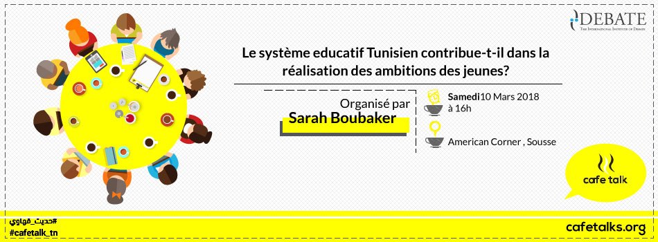 Venez participez et partagez vos avis au Café Talk le samedi 10 mars 2018 a 16h à l’American Corner (prés de Carrefour express Sahloul ).