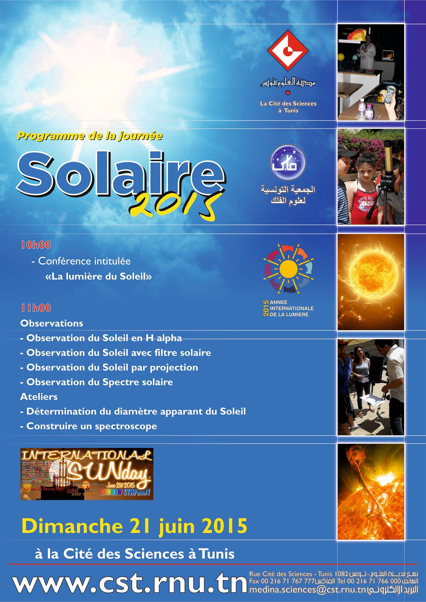 مدينة العلوم بتونس و الجمعية التونسية لعلوم الفلك تنظمان يوم الشمس و ذالك يوم 21 جوان 2015 من الساعة العاشرة صباحا.