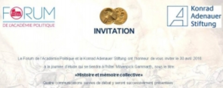 ينظّم منتدى الأكاديمية السّياسيّة ومؤسسة كونراد أديناور يوما دراسيا حول موضوع « التاريخ والذاكرة الجماعية »، وذلك يوم 30 أفريل 2016 إبتداء من السّاعة التّاسعة صباحا.