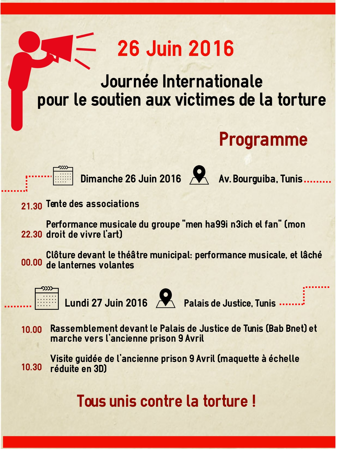 L’Assemblée générale des Nations unies a consacré le 26 juin « Journée internationale pour le soutien aux victimes de la torture » en vue d’éliminer totalement la torture et les mauvais traitements et d’assurer l’application effective de la Convention contre la torture et autres peines ou traitements cruels, inhumains ou dégradants,