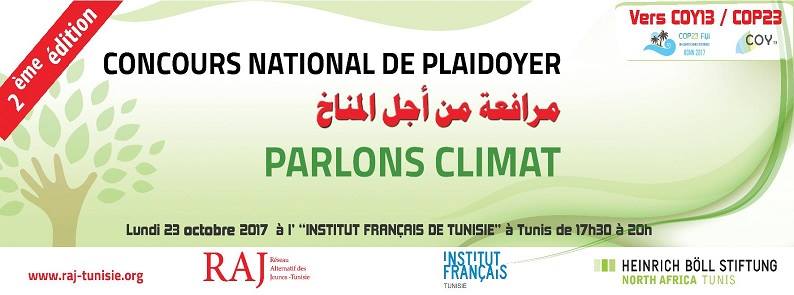 RAJ-Tunisie lance la deuxième édition du Concours National de Plaidoyer, Parlons Climat ! Le concours se tiendra le lundi 23 octobre 2017 à l’auditorium de l’Institut français de Tunis (IFT) à 17h.