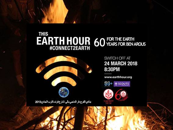 L’année 2018 sera l’occasion de fêter Earth Hour qui coïncide avec la soixantaine du groupe de Ben Arous. Cet évènement aura pour but de mobiliser tous les scouts et les citoyens de Ben Aous pour s’unir dans la lutte contre le changement climatique et pour opter pour les énergies renouvelables. Cet événement se déroulera pour la première fois à Ben Arous et sera célébré dans les locaux du groupe de Ben Arous le 24 Mars 2018 à partir du 8H00 du soir.