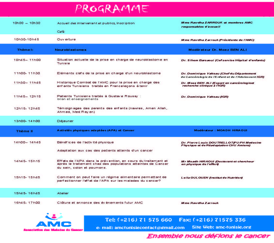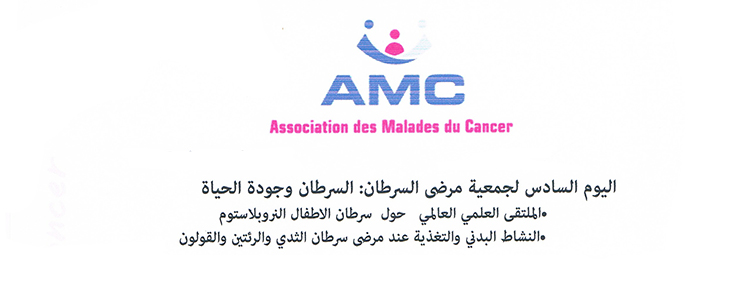 L’Association des malades du Cancer organisera sa 6ème Journée AMC Cancer et qualité de vie sous le thème :« éducation thérapeutique et formation continue ; défit du cancer : de la prise en charge à l’amélioration de la qualité de vie»  qui aura lieu le samedi 21 février 2015 à la cité des Sciences Tunis