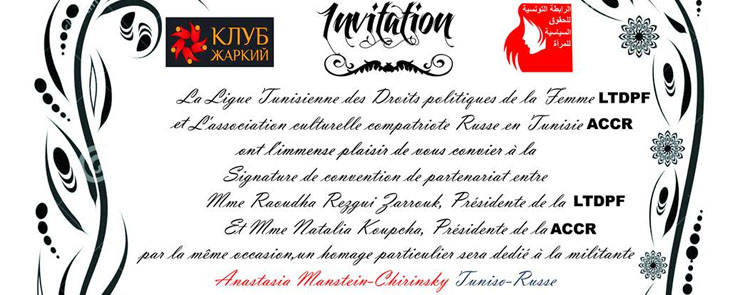 12h00 La signature de CONVENTION DE PARTENARIAT entre La Ligue Tunisienne des Droits politiques de la Femme (LTDPF) et L’association culturelle des compatriotes Russes en Tunisie (ACCR)12h15