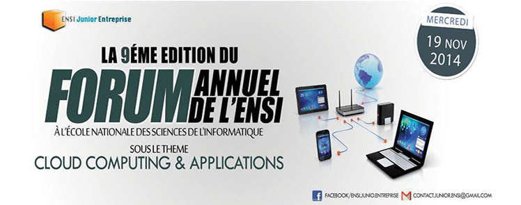 L’ENSI Junior entreprise organise la neuvième édition du forum annuel de l’Ecole Nationale des Sciences de l’Informatique sous le thème de « Cloud Computing et applications » et ce, le 19 Novembre 2014, à partir de 8h30.