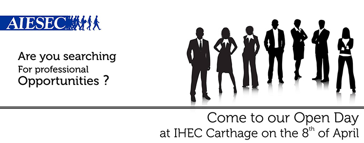 Sous l’égide de l’AIESEC Carthage, une journée portes-ouvertes aura lieu le 8 Avril à l’IHEC Carthage, avec la participation de plusieurs entreprises et associations partenaires de l’association qui ont pris part activement à l’opération recrutement.